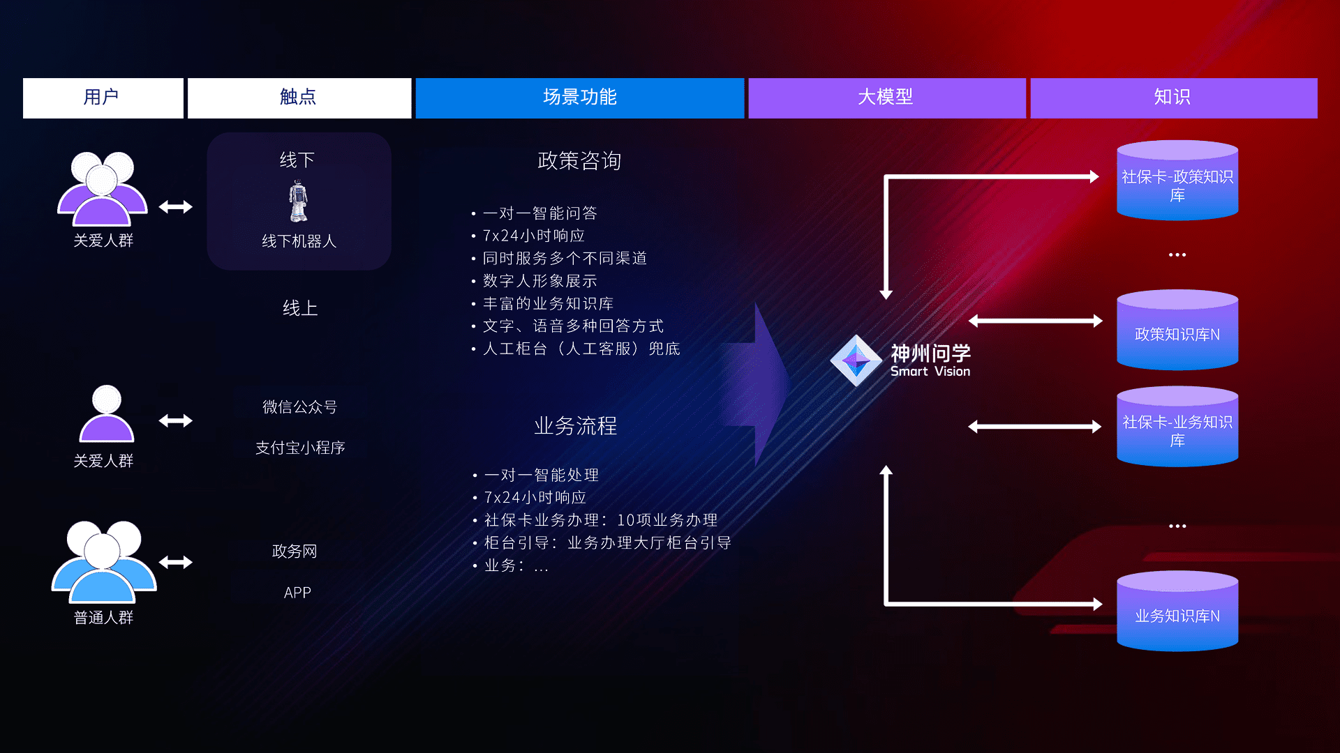 • 线上线下全覆盖:线上提供微信公众号、、支付宝小程序、、政务网、、app多种渠道,,,与线下机器人形成完整服务体系。。。